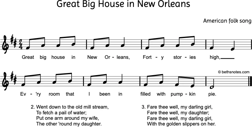 Lyrics (American folk song) 1. Great big house in New Orleans,Forty stories high,Every room that I been inFilled with pumpkin pie. 2. Went down to the old mill stream,To fetch a pail of water;Put one arm around my wife,The other ...