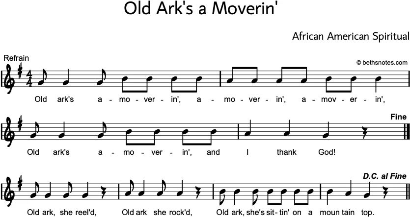 Lyrics (African American Spiritual) RefrainOld ark’s a-moverin’ a-moverin’, a-moverin’Old ark’s a-moverin’ and I thank God. Old ark she reel, old ark, she rock,Old ark a-sittin’ on the mountaintop. (Refrain) See also Country / Culture: US / African American Spirituals Subject: boats Form: ...