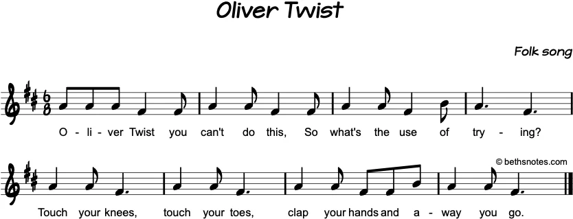 Lyrics (Folk song) Oliver Twist, you can’t do this,So what’s the use of trying?Touch your knees, touch your toes,Clap your hands and away you go. Recorder Notes E, G, A Motions See ideas in the download below. See also Activity: ...