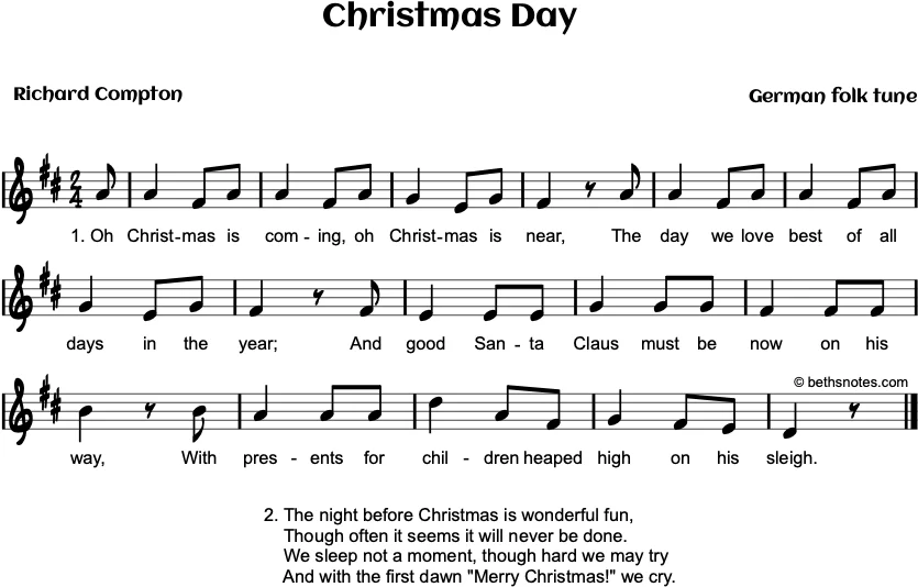 Lyrics (German folk tune, Lyrics by Richard Compton) 1. Oh Christmas is coming, oh Christmas is near,The day we love best of all days in the year;And good Santa Claus must be now on his way,With presents for children heaped ...