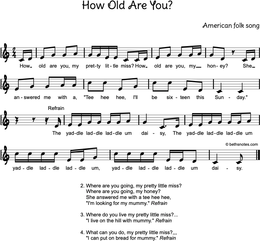 Lyrics (American folk song) How old are you, my pretty little miss?How old are you, my honey?”She answered me with a tee hee hee,“I’ll be sixteen this Sunday.” RefrainThe yaddle laddle laddle um daisy,The yaddle laddle laddle um yaddle laddle laddle um,Yaddle ...