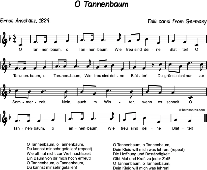Lyrics – German (German folk tune, Lyrics by Ernst Anschútz, 1824) O Tannenbaum, o Tannenbaum,Wie treu sind deine Blätter! (repeat)Du grünst nicht nur zur Sommerzeit,Nein, auch im Winter, wenn es schneit.O Tannenbaum, o Tannenbaum,Wie treu sind deine Blätter! O Tannenbaum, ...