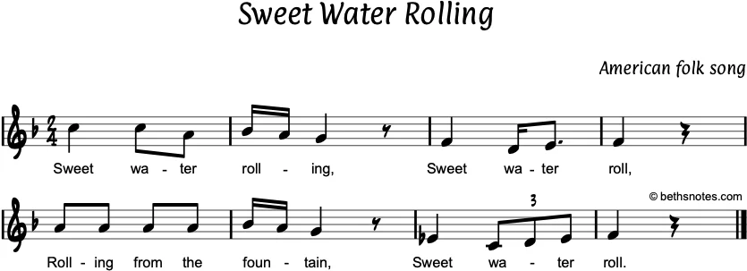 Lyrics (American folk song) Sweet water rolling,Sweet water roll,Rolling from the fountain,Sweet water roll. See also Country: US Subject: water Harmony: I, IV, V / countermelodies / Orff Melody: G,A,B / B,C,D’ Meter: 2 Rhythm: Source: American Folk Songs for Children,Ruth ...
