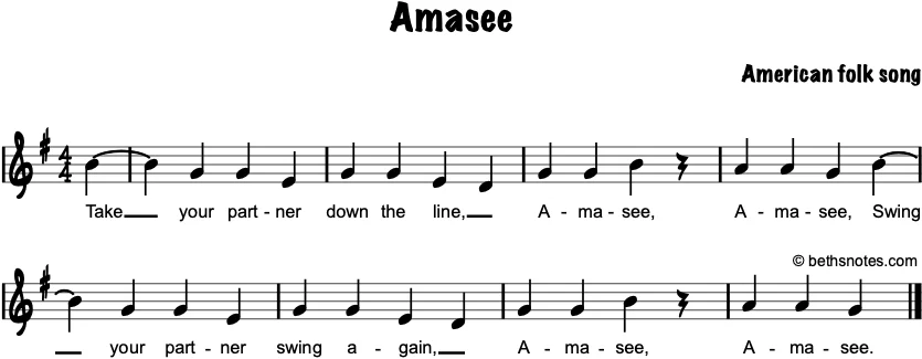 Lyrics (American folk song) Take your partner down the line,Amasee*, amaseeSwing your partner, swing againAmasee, amasee *Amasee = “I must see” Movement Formation: two lines of partners facing each other with the “head couple” at one end of the lines ...