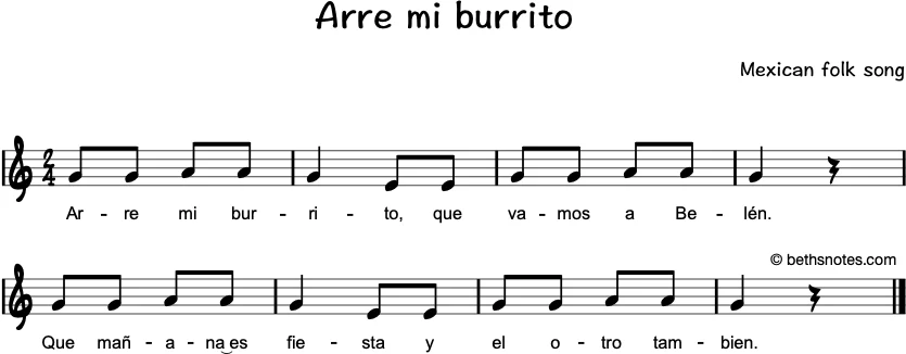 Lyrics – Spanish (Mexican folk song) Arre mi burritoVamos a BelénMañana es fiestaEl otro también English Translation – Giddy-up my donkey Giddy-up, my donkey,We’re going to Bethlehem.Tomorrow is a party,And the other day also. See also Country: Mexico Subjects: Christmas ...