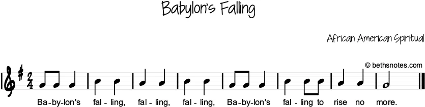 Lyrics (African American Spiritual) Babylon’s falling, falling, falling,Babylon’s falling to rise no more. See also Country / Culture: US / African American Spiritual Harmony: I, V / Orff Melody: do re mi / composing melodies / high & low / steps, skips, ...