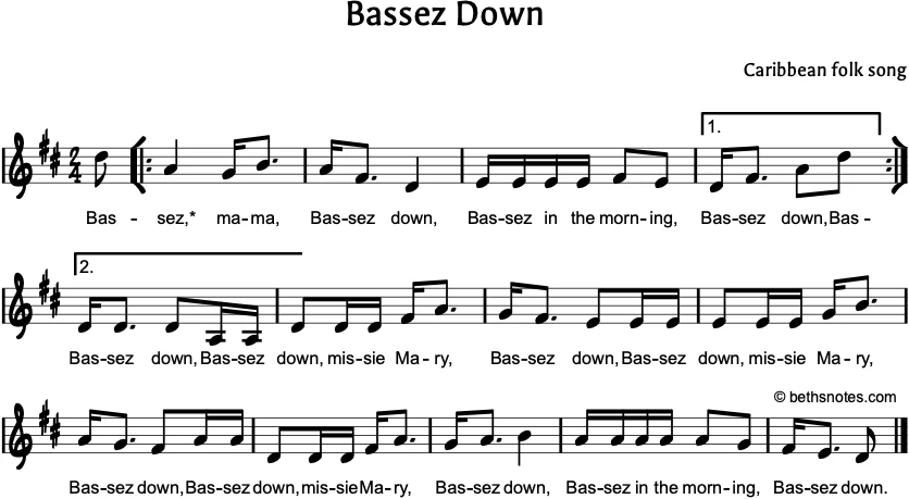 Lyrics (Caribbean folk song) Bassez*, mama, Bassez down,Bassez in the morning, Bassez down. (repeat) Bassez down, Missie Mary, Bassez down,Bassez down, Missie Mary… *Pronounced “bassay” In Renaissance dance, basse danse means “low dance”. In French the suffix changes to bassez ...