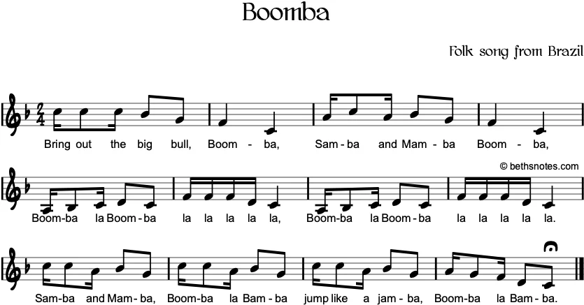 Lyrics (Brazilian folk song) Bring out the big bull, Boomba,Samba and Mamba Boomba,Boomba la Boomba, La la la la la, (repeat)Samba and Mamba, Boomba la Bamba,Jump like a jamba,Boomba la Bamba. See also Country: Brazil Subjects: national anthems Form: call & ...