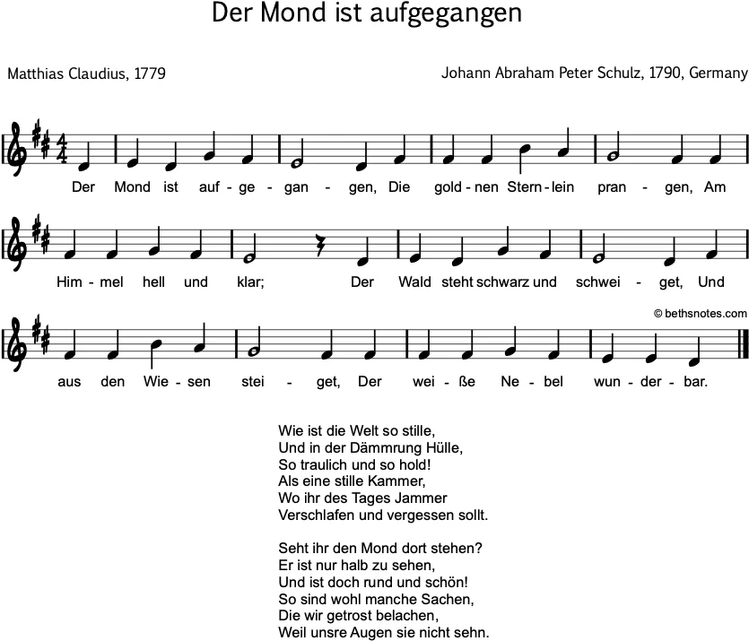 Lyrics (Melody by Johann Abraham Peter Schulz, 1790, Germany, Lyrics by Matthias Claudius, 1779) Der Mond ist aufgegangen,Die goldnen Sternlein prangen,Am Himmel hell und klar;Der Wald steht schwarz und schweiget,Und aus den Wiesen steigetDer weiße Nebel wunderbar. Wie ist die ...