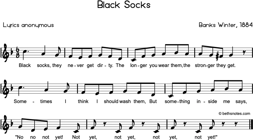 Lyrics (Melody by Banks Winter, 1884, Lyrics anonymous) Black socks, they never get dirty.The longer you wear them, the stronger they get.Sometimes I think I should wash them,But something inside me says, “No no not yet.”Not yet, not yet, not ...