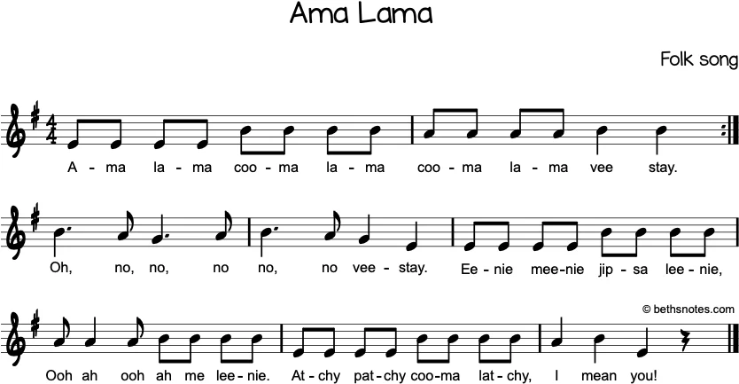 Lyrics (Folk song) Ama lama cooma lama cooma lama veestay.Ama lama cooma lama cooma lama veestay.Oh no no, no no no veestay.Eenie meenie gipsa leenie ooh ah ooh ah me leenie,Atchy patchy cooma latchy I mean you! See also Subject: silly ...