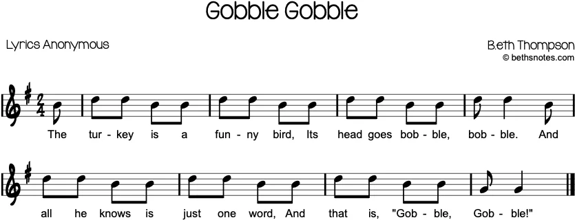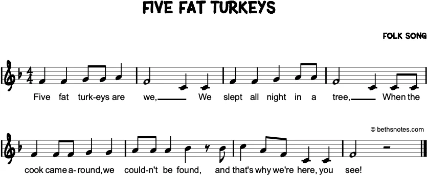 Lyrics (Folk song) Five fat turkeys are weWe slept all night in a treeWhen the cook came around, we couldn’t be foundAnd that’s why we’re here you see! Recorder Notes D, G, A, B, C, D’ See also Subjects: Thanksgiving ...