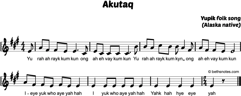Info Akutaq or agutak is a common food in western Alaska, consisting of whipped fat mixed with berries, with optional additions such as fish and sugar. The Yupik word means “something mixed.” (source) Lyrics (Yupik folk song, Alaska Native) Yu ...