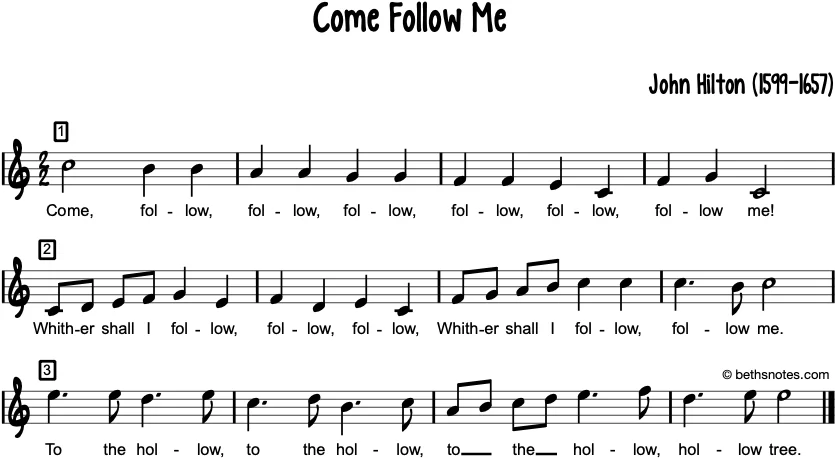 Lyrics (John Hilton, 1599-1657) Come, follow, follow, follow, follow, follow, follow me!Wither shall I follow, follow, followWither shall I follow, follow me.To the hollow, to the hollow, to the hollow, hollow tree*. *Other versions say “to the Greenwood tree.” “Greenwood tree” ...