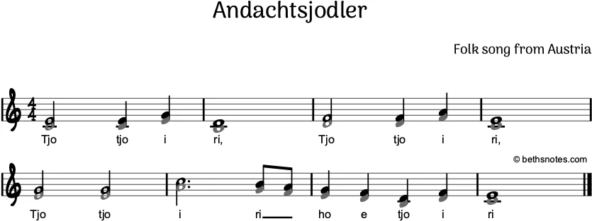 Lyrics – Austrian German (Folk song from Austria) Tjo tjo i riTjo tjo i riTjo tjo i riho e tjo i ri English Translation – Devotional yodel Lyrics have no meaning See also Country: Austria Subject: Christmas Harmony: I, IV, V ...
