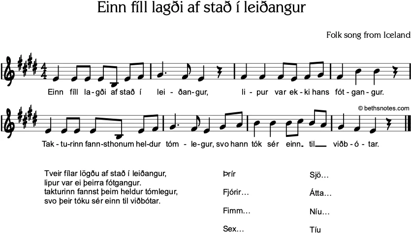 Lyrics – Icelandic (Folk song from Iceland) Einn var ekki hans fótgangurtakturinn fannst honum heldur tómlegursvo hann tók sér einn til viðbótar. Tveir fílar lögðu af stað í leiðangur,lipur var ei þeirra fótgangur.takturinn fannst þeim heldur tómlegur,svo þeir tóku sér ...