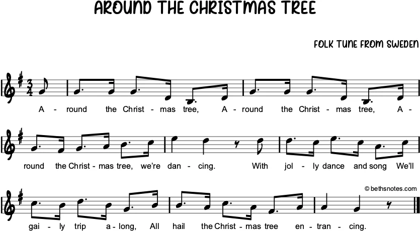 Lyrics (Folk tune from Sweden) Around the Christmas treeAround the Christmas treeAround the Christmas tree, we’re dancingWith jolly dance and songWe’ll gaily trip alongAll hail the Christmas tree entrancing. All hail! The Christmas cheerAll hail! The glad New YearOh! Sing ...