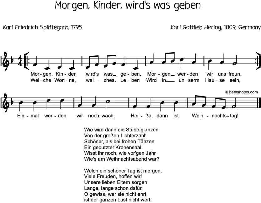 Lyrics – German (Melody by Karl Gottlieb Hering, 1809, Lyrics by Karl Friedrich Splittegarb, 1795) Morgen, Kinder, wird‘s was geben!Morgen werden wir uns freun!Welche Wonne, welches LebenWird in unserm Hause sein,Einmal werden wir noch wach,Heißa, dann ist Weihnachtstag! Wie wird ...